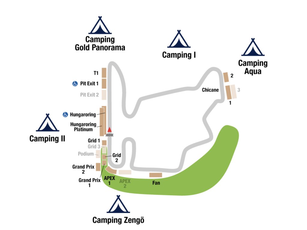Camping Gold Panorama: Nachází se v blízkosti Brány 8, z kempu je pěkný výhled na údolí Hungaroringu. Kemp je vybaven elektřinou. V blízkosti je stanoviště taxi a stánky s občerstvením. Kempovací balíček je možné zajistit pro 2-4 osoby na 3 nebo 4 noci.