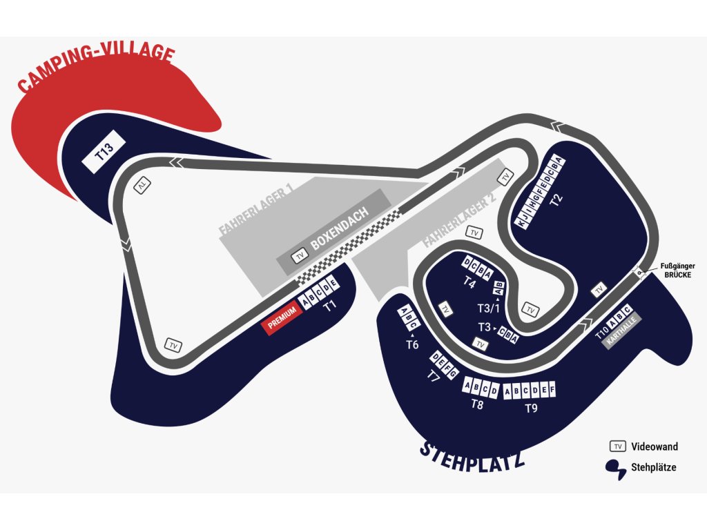 DALŠÍ INFO: Na tribuně T13 nejsou číslovaná místa (je zde volné sezení). // Mapka okruhu je orientační a uvádí přibližné rozmístění tribun na okruhu. Případná změna termínu akce neopravňuje ke stornu objednávky.